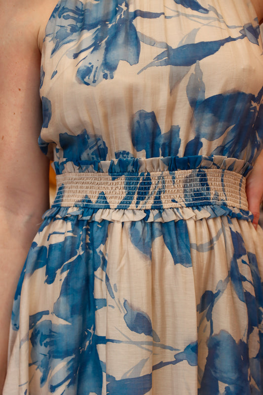 CONTRAST SHOULDER TIE W/BINDING DETAIL FLORAL MAXI DRESS