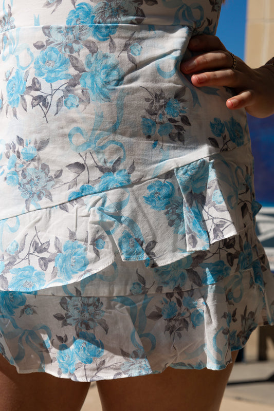 RIBBON FLORAL ASYMMETRIC LAYERED RUFFLE MINI DRESS