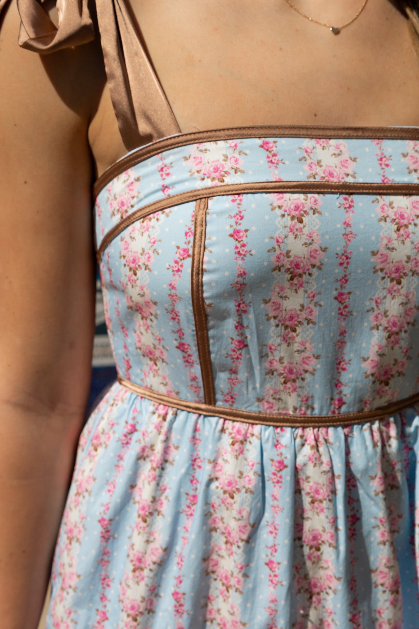 CONTRAST SHOULDER TIE W/BINDING DETAIL FLORAL MAXI DRESS