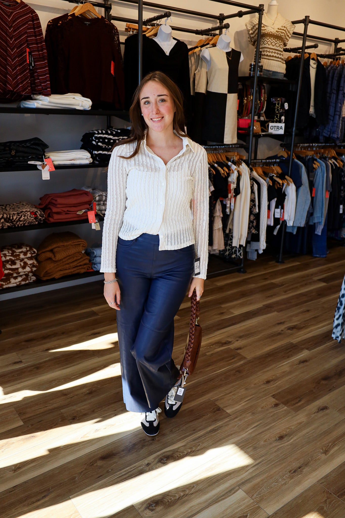 The Cortina Hi-Waist Wide Leg Vegan Leather pant is a bold and modern wardrobe staple. Designed with a high waist, it elongates the legs and creates a flattering silhouette. The wide-leg cut offers comfort and movement while making a fashion-forward statement. Made from vegan leather, it delivers a sleek, polished look without animal products. Perfect for dressing up or down, it pairs effortlessly with tops and jackets for versatile style.