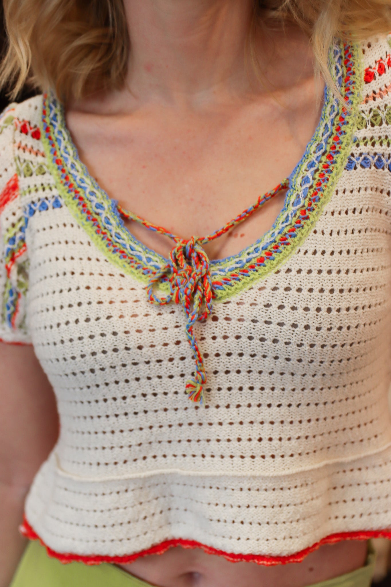 A lightweight crop top with short sleeves and open crochet detailing in vibrant colors. Made from a breathable cotton-blend fabric, it's perfect for spring and summer layering or wearing solo.