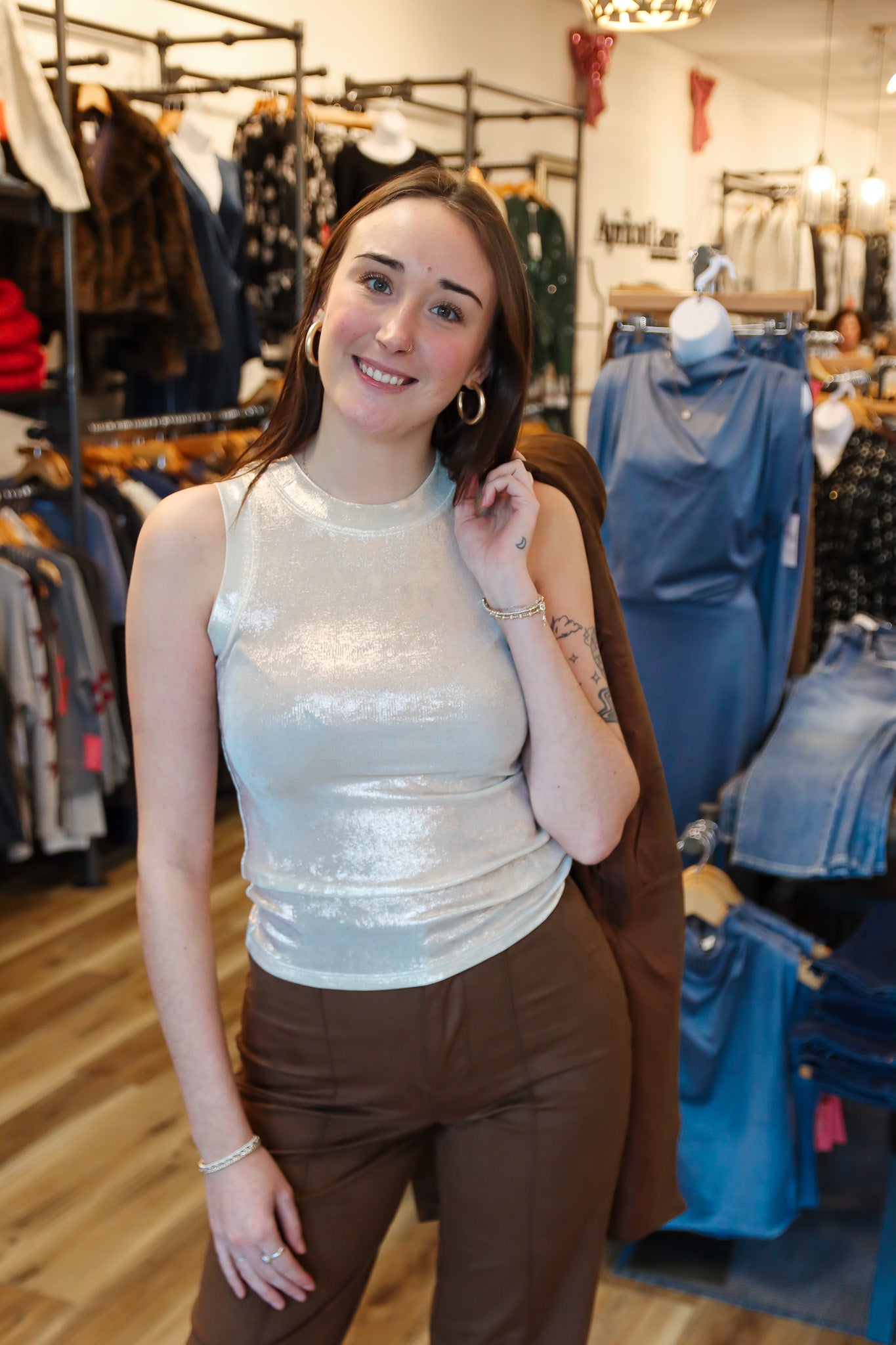 The Metallic Black Tank Top adds sleek, modern shine to any outfit. Crafted from a smooth, stretchy fabric with a subtle metallic finish, it offers a flattering, body-skimming fit that’s perfect for layering or wearing on its own. Its minimalist silhouette makes it easy to style with skirts, denim, or tailored pieces. A chic, versatile staple that brings effortless edge and shimmer to day or night looks.