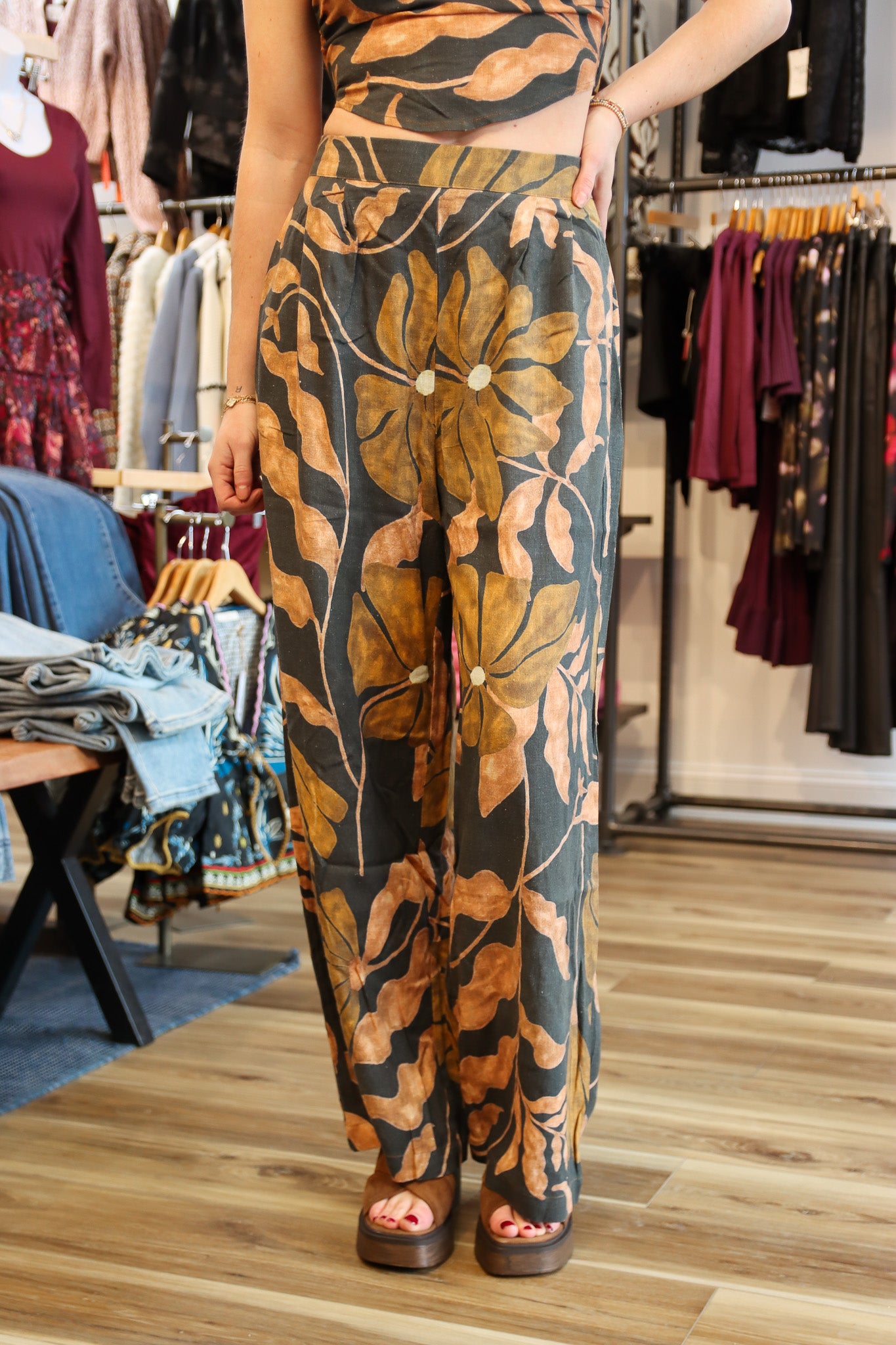 MUTED FLORAL PRINT LINEN WIDE LEG PANT