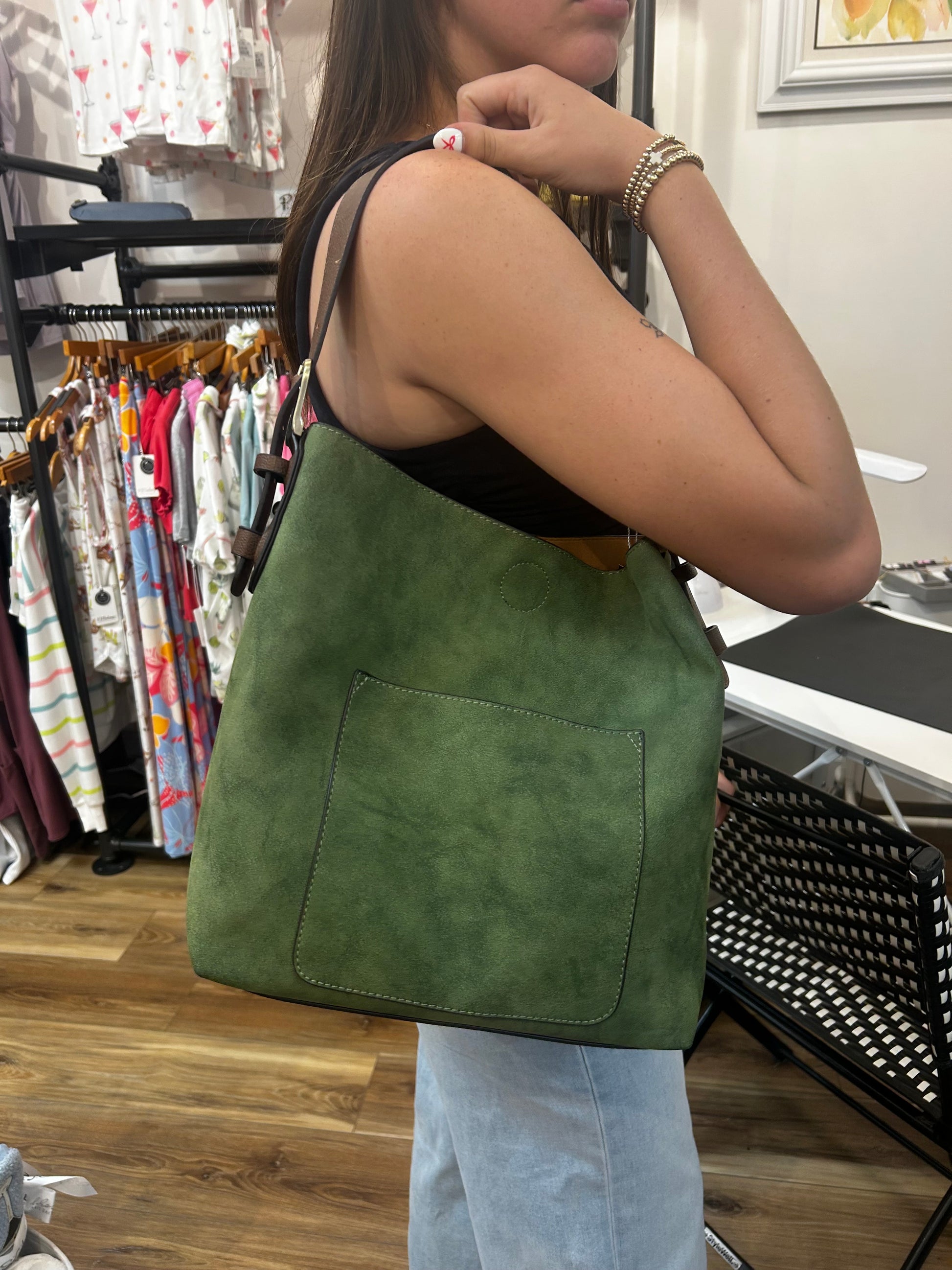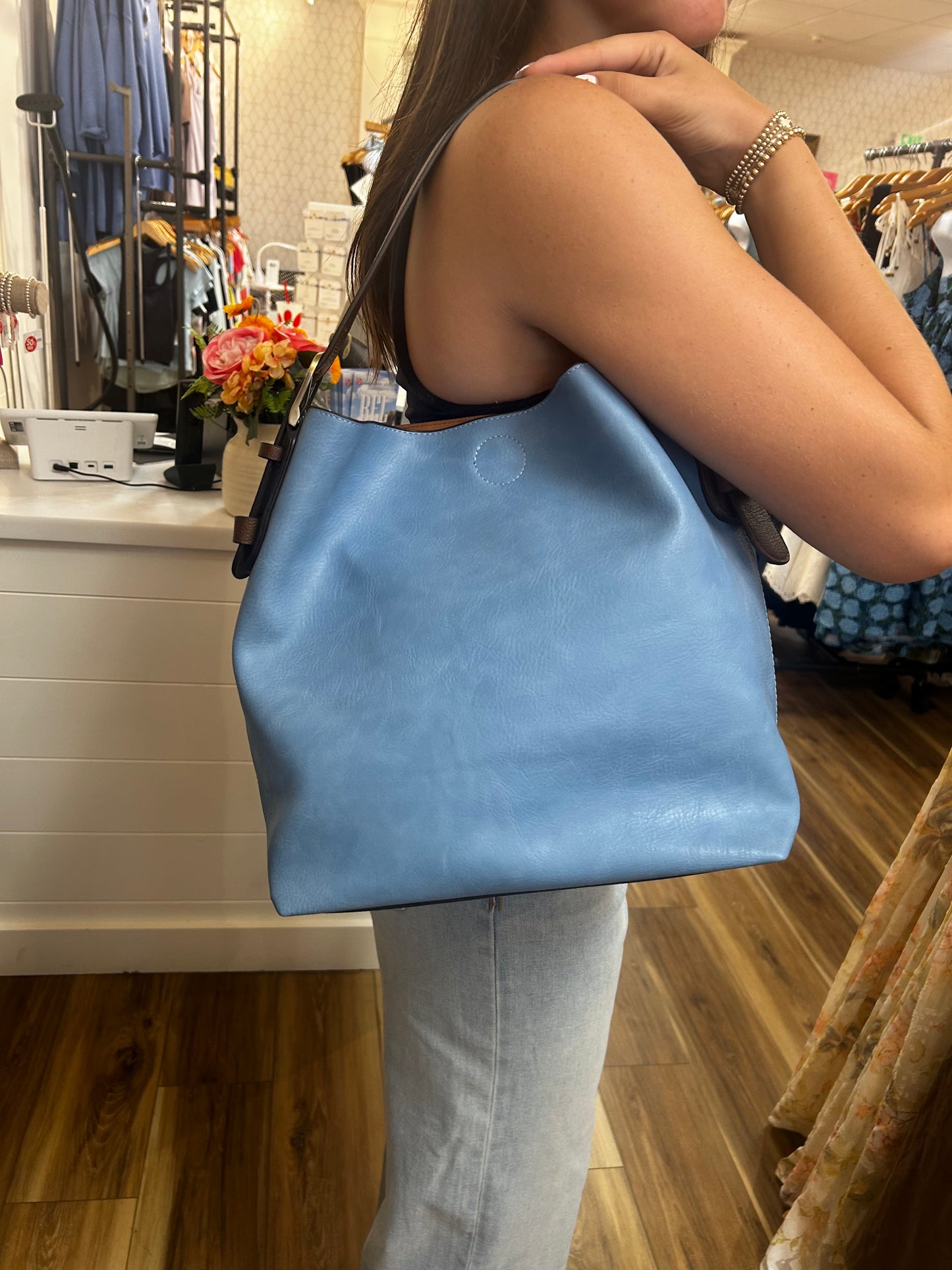 Effortlessly chic with a touch of boho flair, this stylish hobo bag features a single top handle and a relaxed, slightly slouchy silhouette. Crafted from tumbled vegan leather and accented with gleaming hammered rivets, it blends laid-back ease with luxe detail. Slim yet surprisingly spacious, it’s the perfect companion for carrying your daily essentials in elevated style.