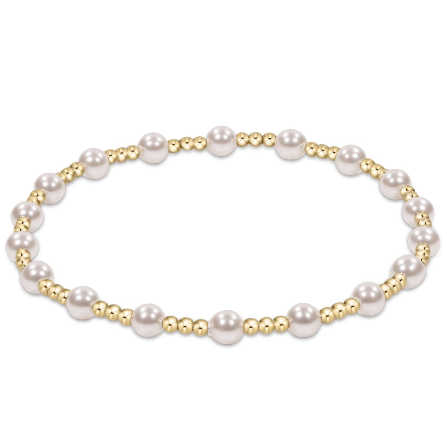 You’ll fall in love with this timeless sincerity pattern bracelet featuring alternating 4mm crystal pearls and 2mm 14kt gold-filled beads. Elegant and effortless, it’s hand-beaded on high-performance elastic for a comfortable stretch that easily rolls on and off your wrist. Designed for worry-free wear—sleep, shower, and sweat in it—this classic gold bracelet is perfect for everyday elegance.