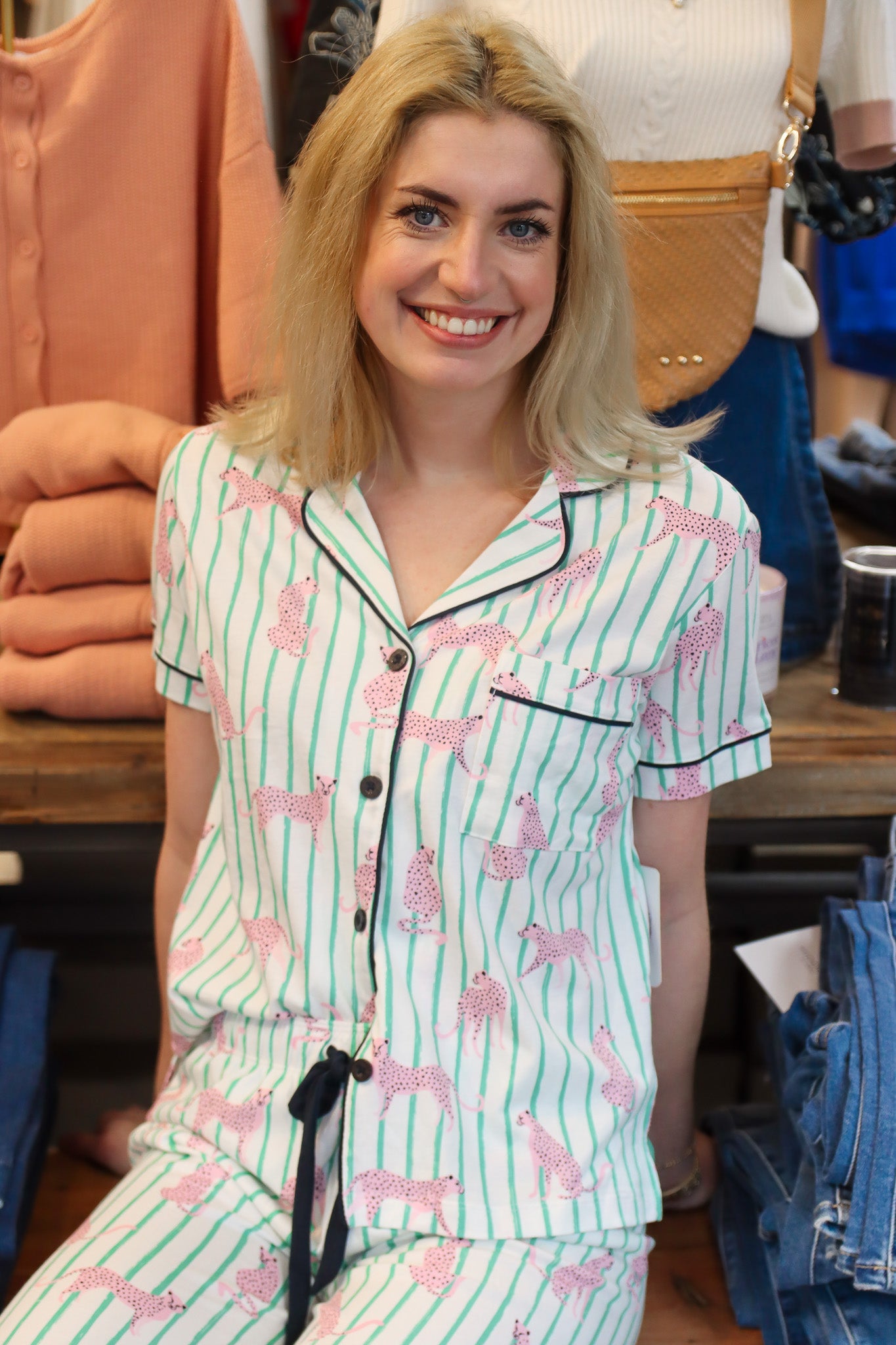 This cool cat pj set features a fabric blend of 52% cotton and 48% modal, ensuring breathability and comfort. The button-down top and adjustable drawstring provide a customized fit, while the striped jaguar print adds a contemporary touch. Ideal for warm nights, the cropped pant design enhances ease of movement.