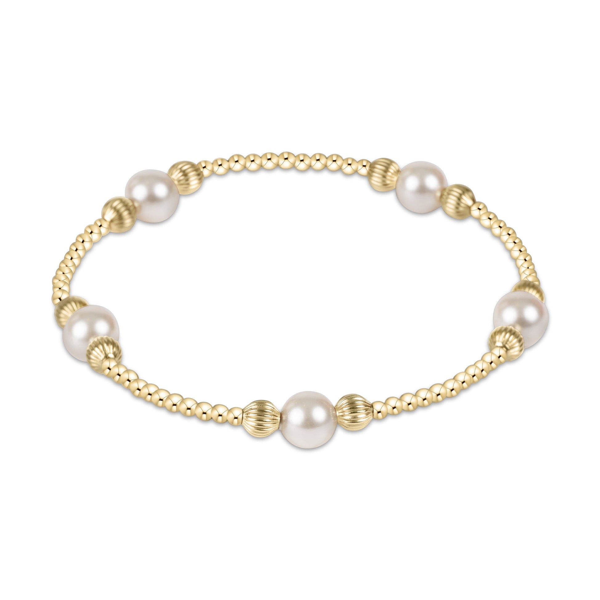 Timeless and luminous, this bracelet features 6mm crystal pearls paired with 3mm and 4mm 14k gold-filled beads for a beautifully balanced look. Hand-beaded on high-performance elastic, it offers a slight stretch for easy roll-on and off comfort. Designed for worry-free wear—sleep, shower, and sweat in it. A classic piece that adds elegance to any stack or stands out beautifully on its own.