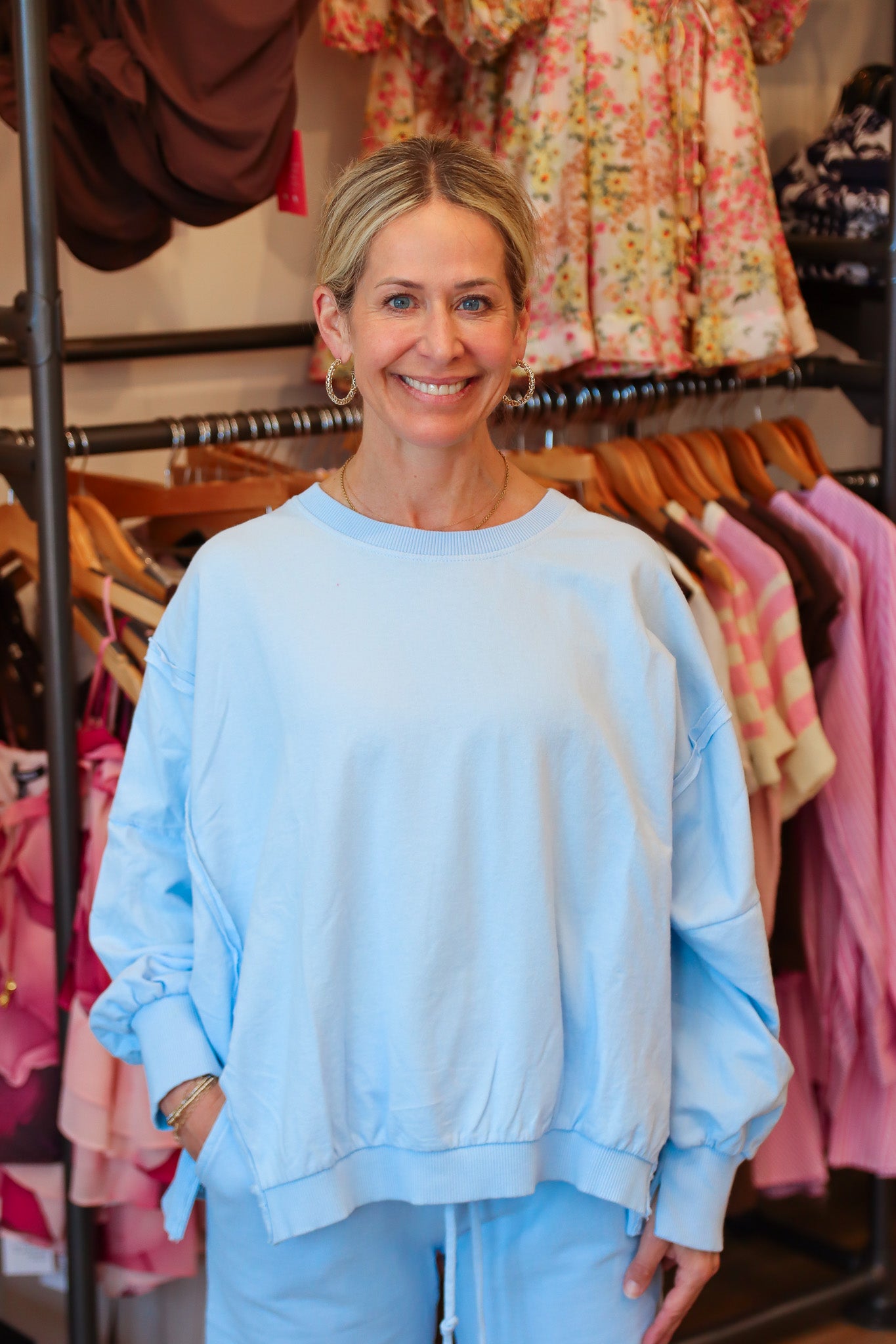 Experience ultimate comfort with the Suzy D “Werugia” Oversize Raw Edge Sweatshirt. Designed in a one-size-fits-all oversized fit, it’s perfect for lounging or layering. Pair it with matching pants (sold separately) for a chic, effortless look that elevates your downtime style. Enjoy the cozy feel and versatility of your new favorite loungewear.