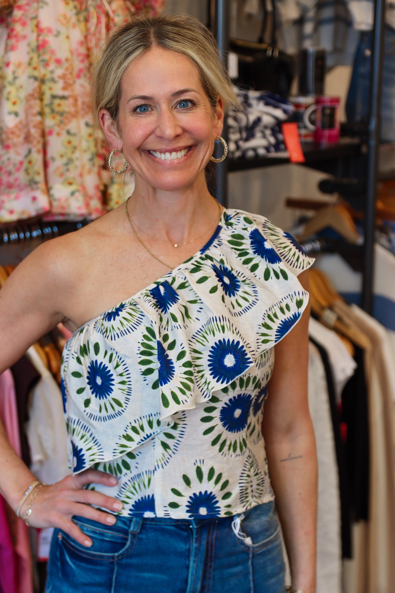 Elevate your style with the Traffic People “When I Close My Eyes” Bella Top. Featuring a chic one-shoulder design and a unique abstract print, this top is versatile enough for vacations or a night out with friends. The slightly cropped fit and feminine ruffle add a playful touch, making it a must-have for any wardrobe.
